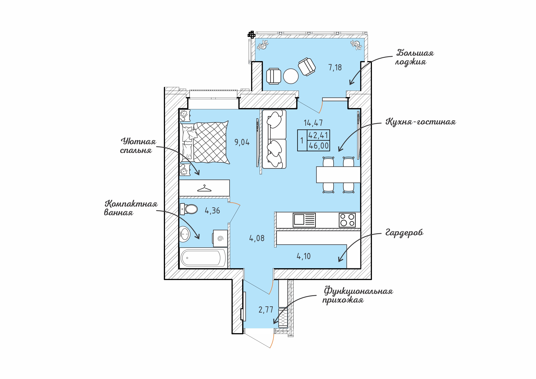 1 комнатная квартир, 46.44